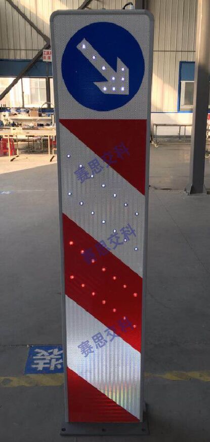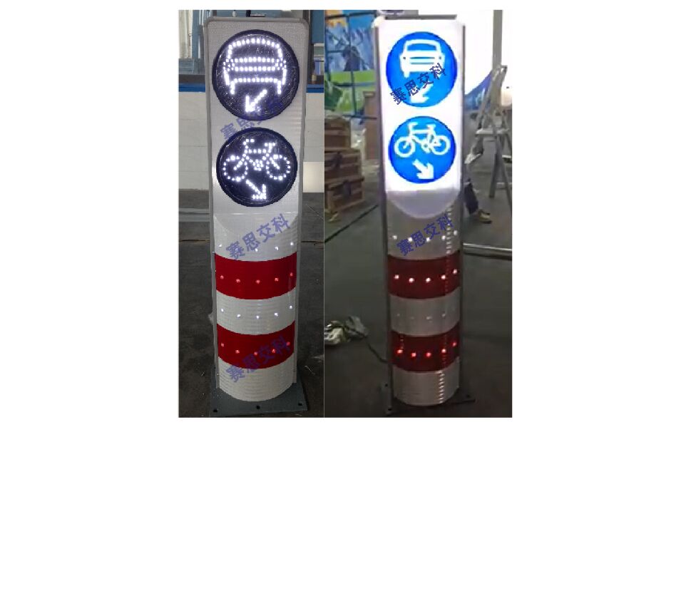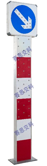 2、基本說明:采用一體式柱體結構,標志版面圖案中嵌入LED發光管,柱體上設置警示發光管,采用太陽能蓄電池供電,設置于中央隔離帶端口。